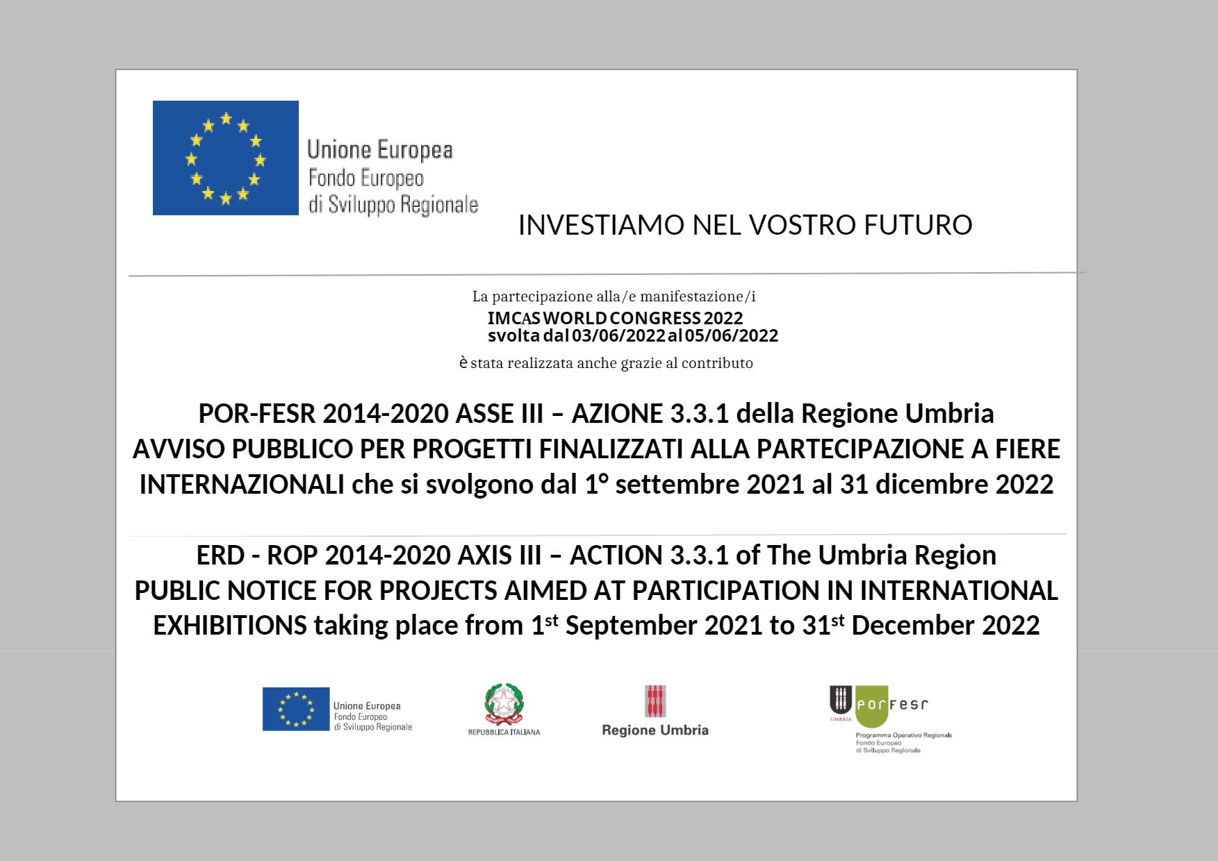 The intervention was carried out with the support of the POR FESR Umbria 2014-2020 Funds – Az. 3.3.1 – Public Notice for participation Internationalisation project 2021-2022.